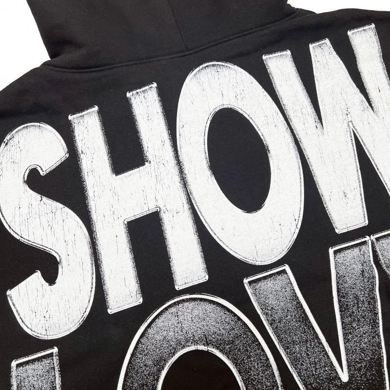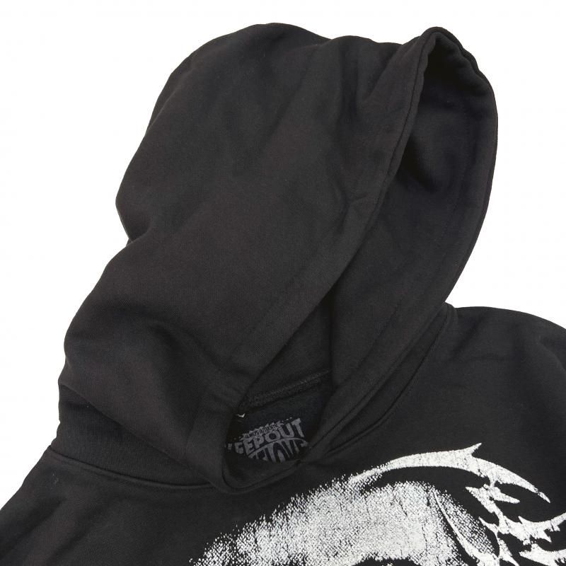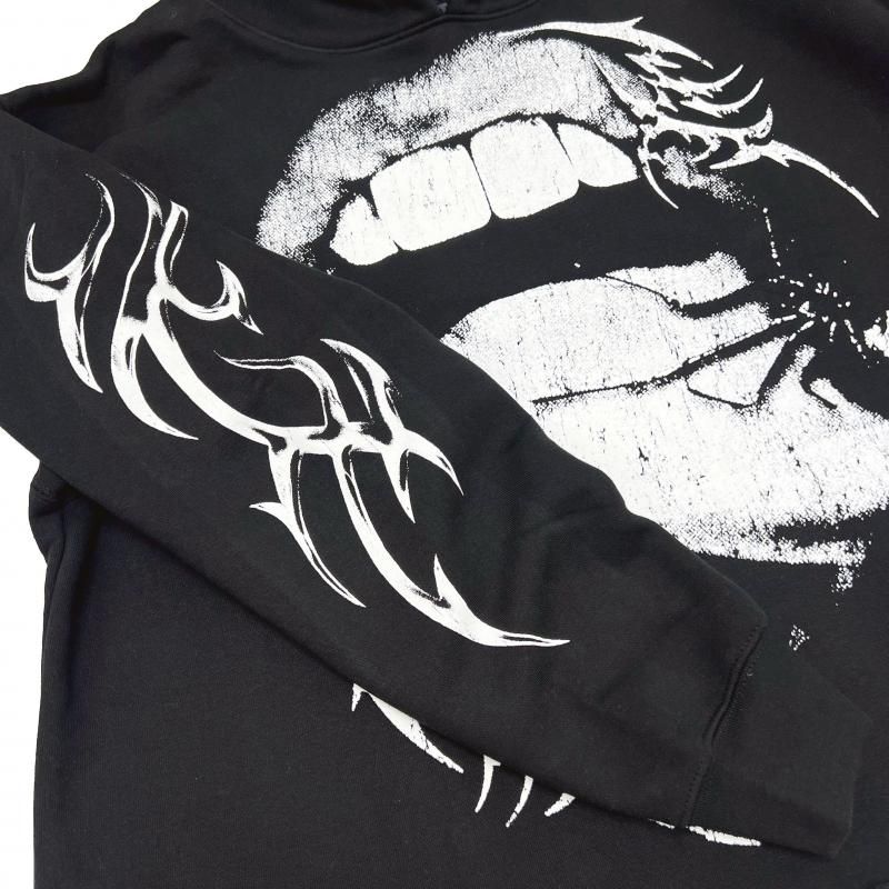 フロントにマウスデザイン、袖にトライバルデザイン、バックにフォントデザインのプリントを施したパーカー。