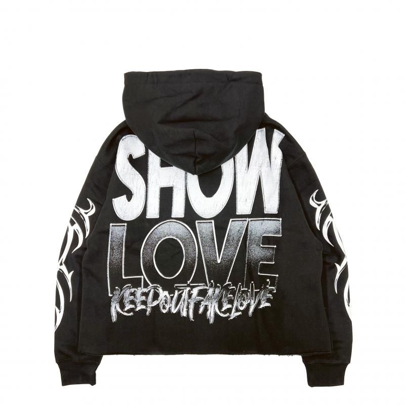 KEEP OUT FAKE LOVE / FREE LOVE CROPPED FLEECE HOODIE