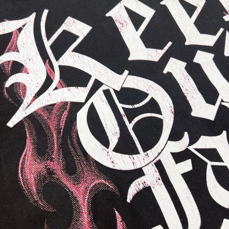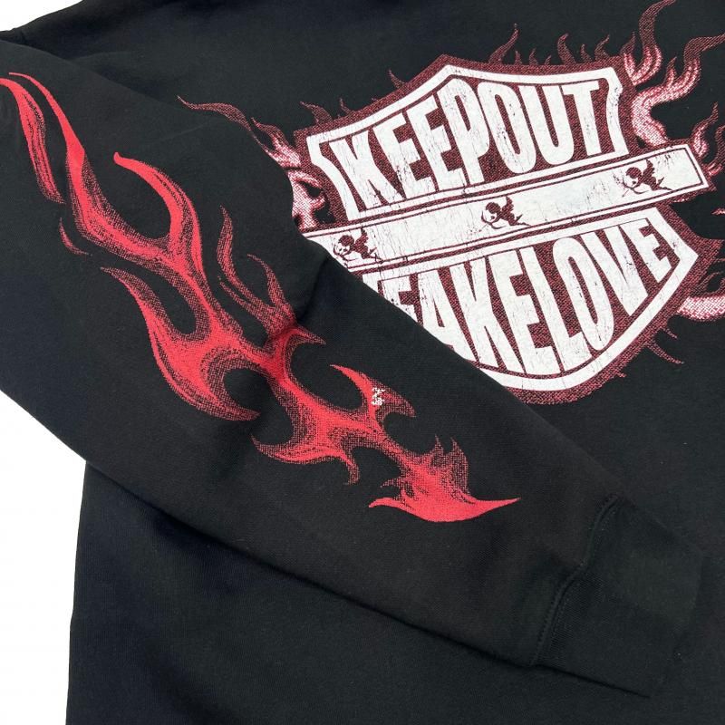 フロントに某バイクメーカーのロゴをサンプリングしたデザイン、袖にフレイムデザイン、バックにブランドネームのプリントを施したパーカー。
