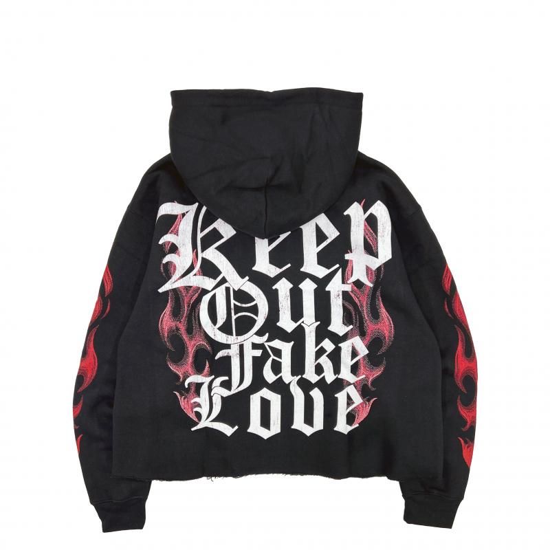 KEEP OUT FAKE LOVE / SMOKED CROPPED FLEECE HOODIE