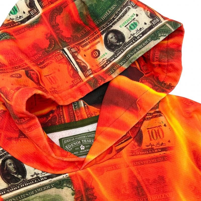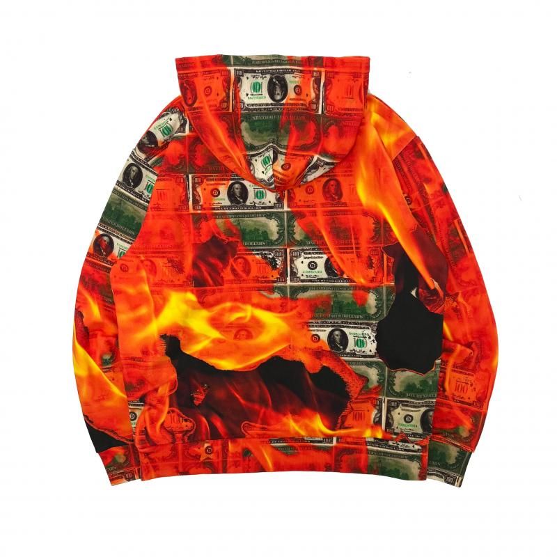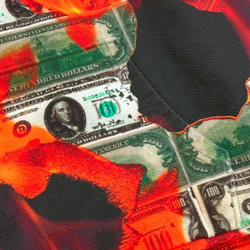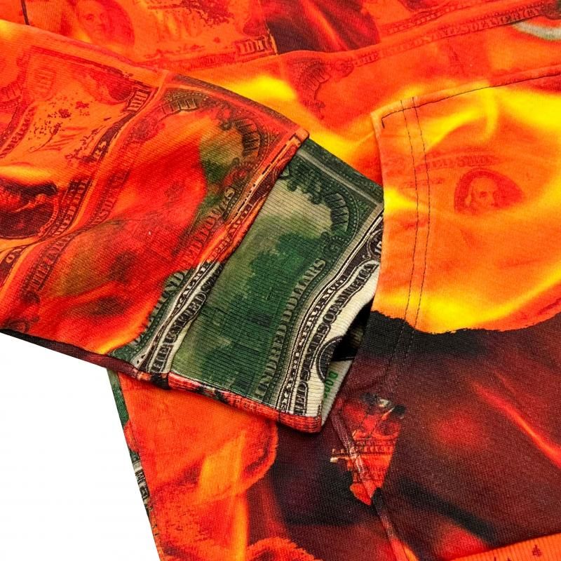 炎に包まれた100ドル札のデザインを総柄で用いたパーカー。