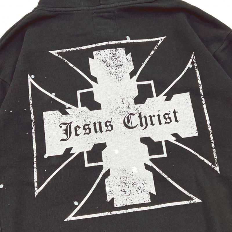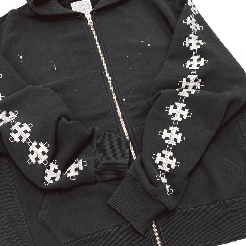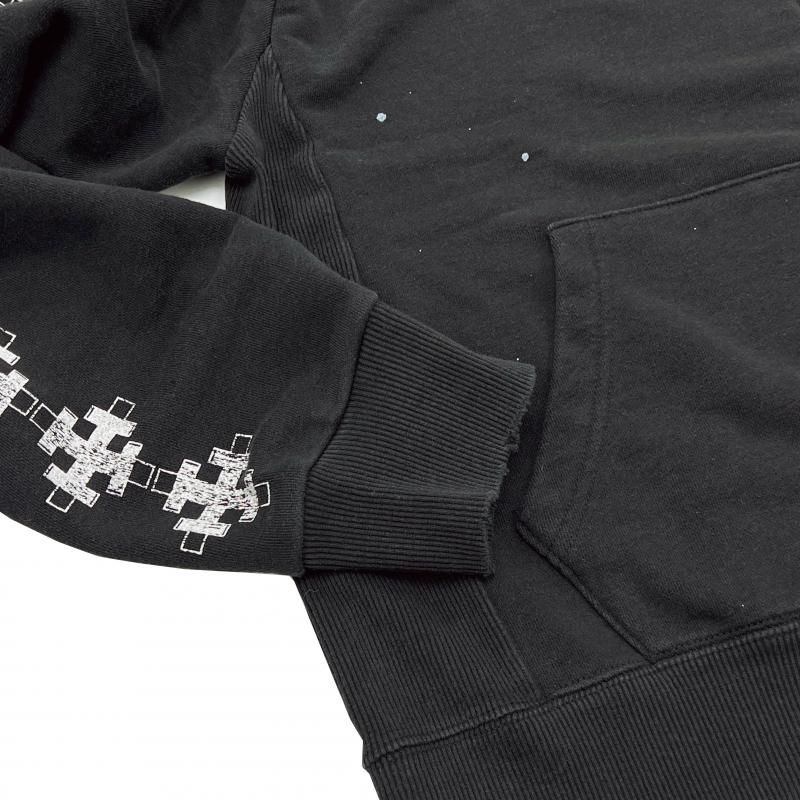 バック・袖にクロスデザインをプリントで施し、身頃にスプラッシュ状のペンキを施したジップアップパーカー。
