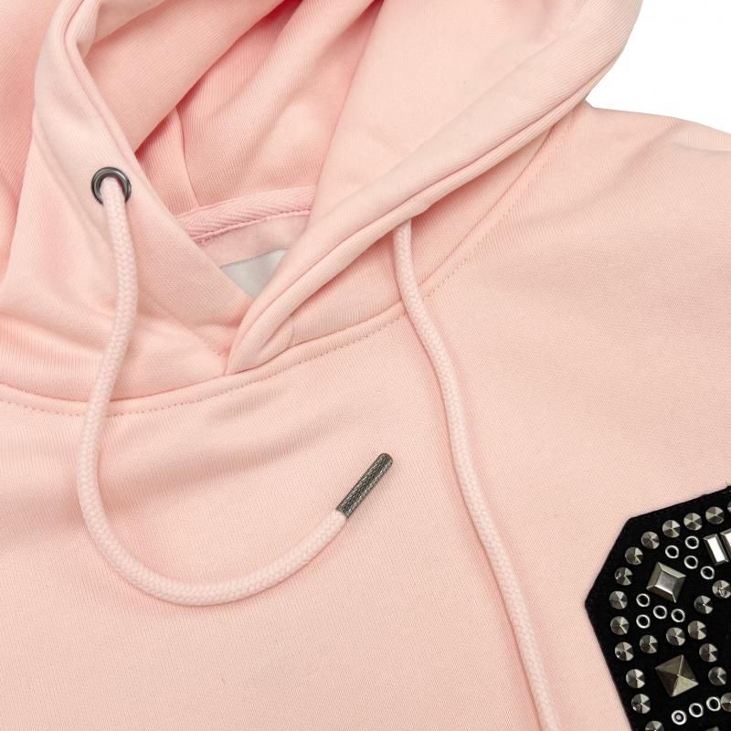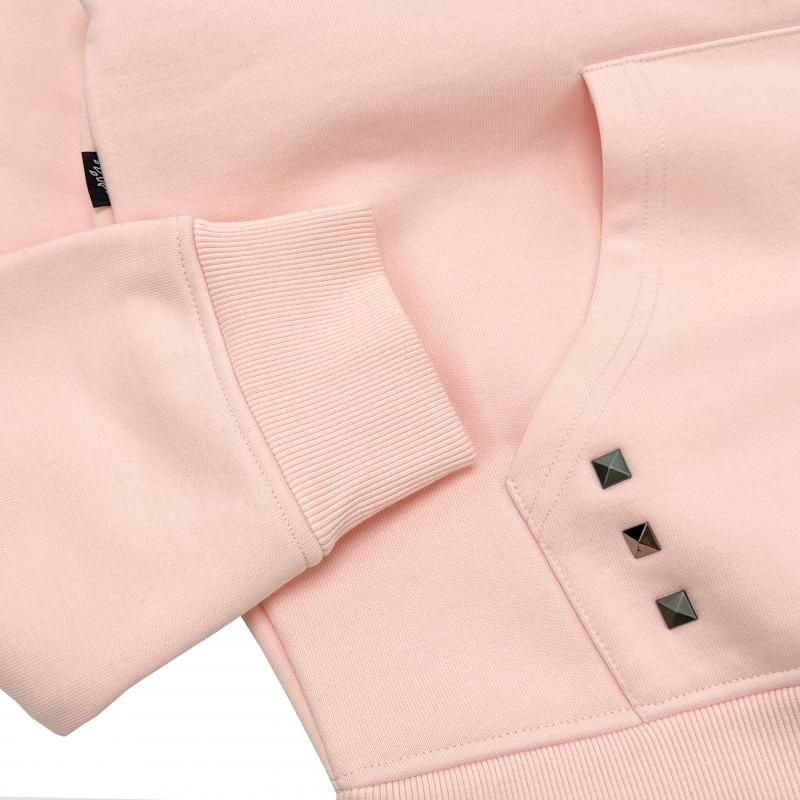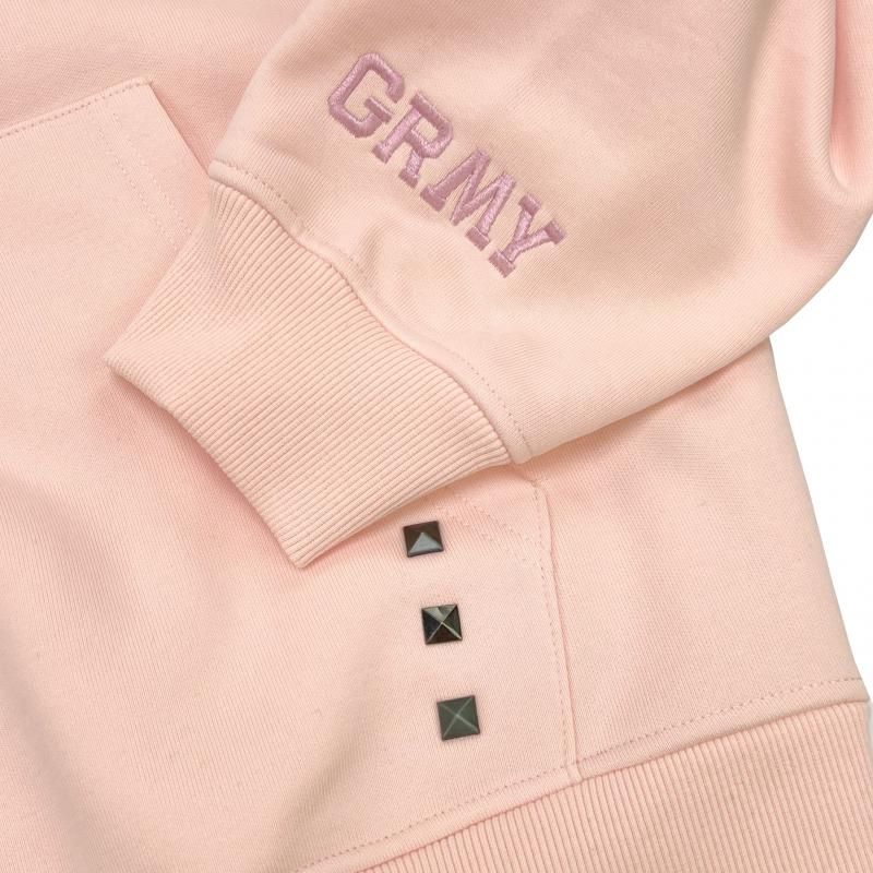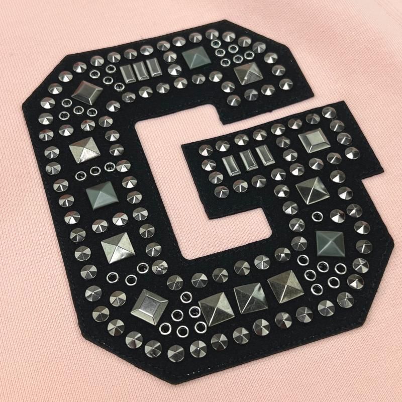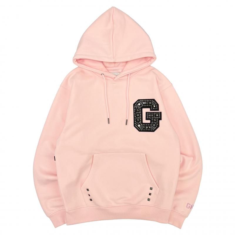 胸元にスタップを施したGのワッペン、ポケットにスタッズ、袖口にブランドネームの刺繍を施したパーカー。