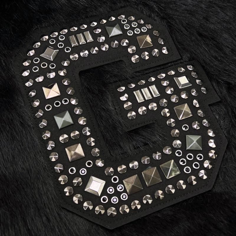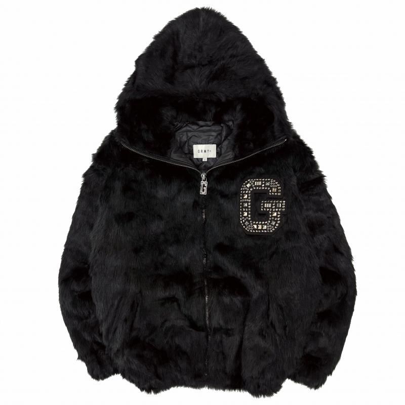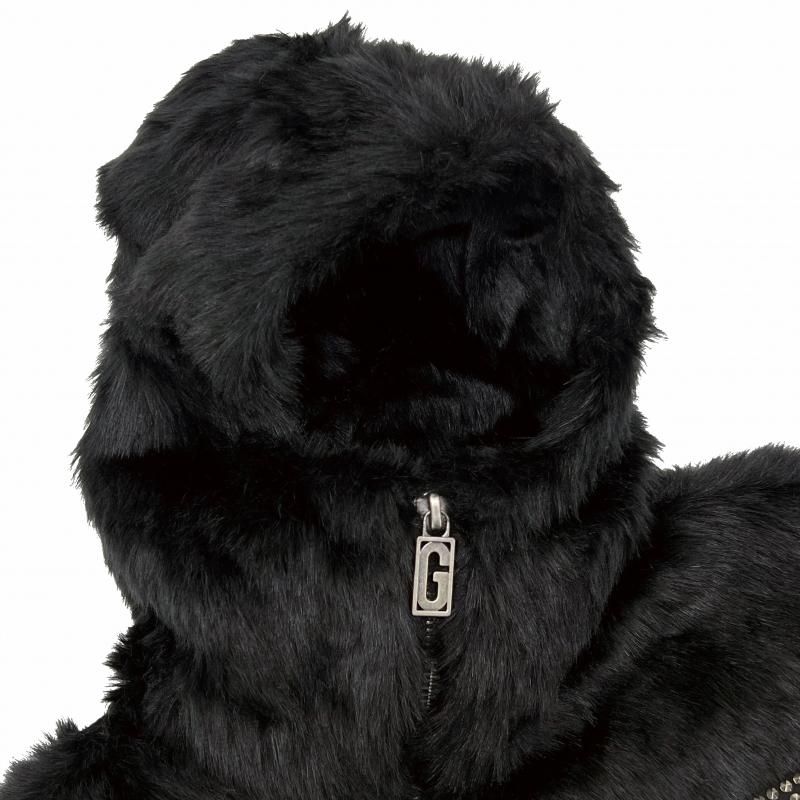 胸元にスタップを施したGのワッペンを用いたフード付きファージャケット。