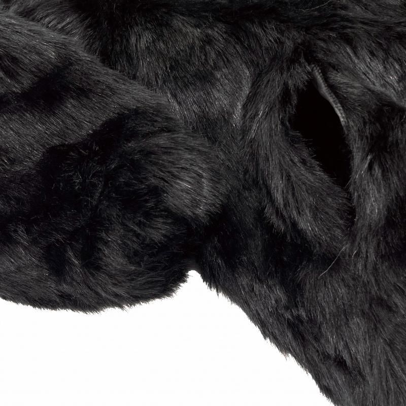 表地にはポリエステル素材のフェイクファーを使用(サイドポケット×2)、裏地にはキルティング生地を使用(内ポケット×1)しています。