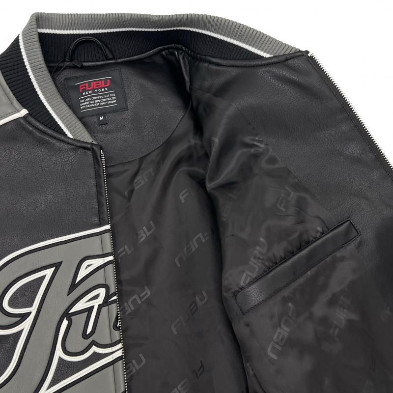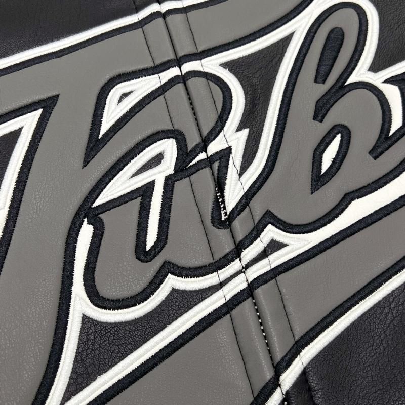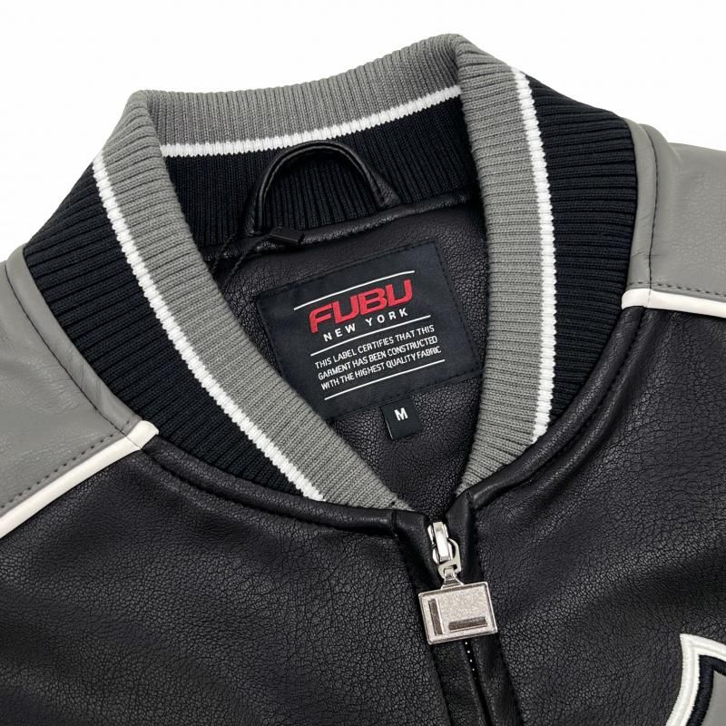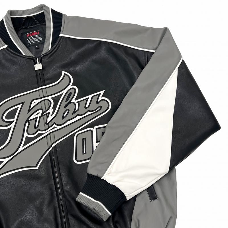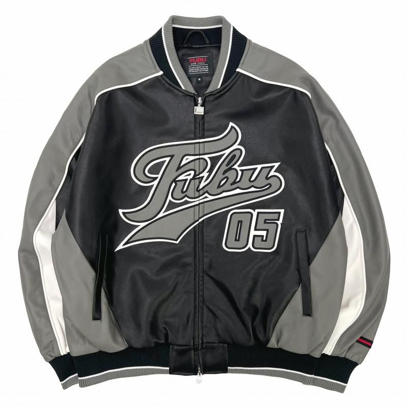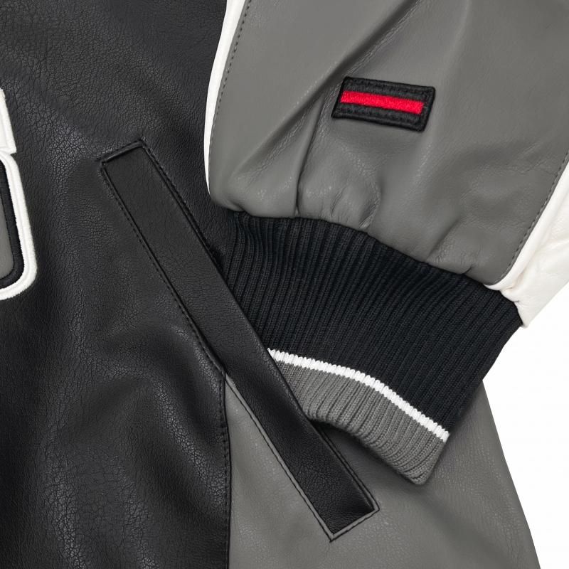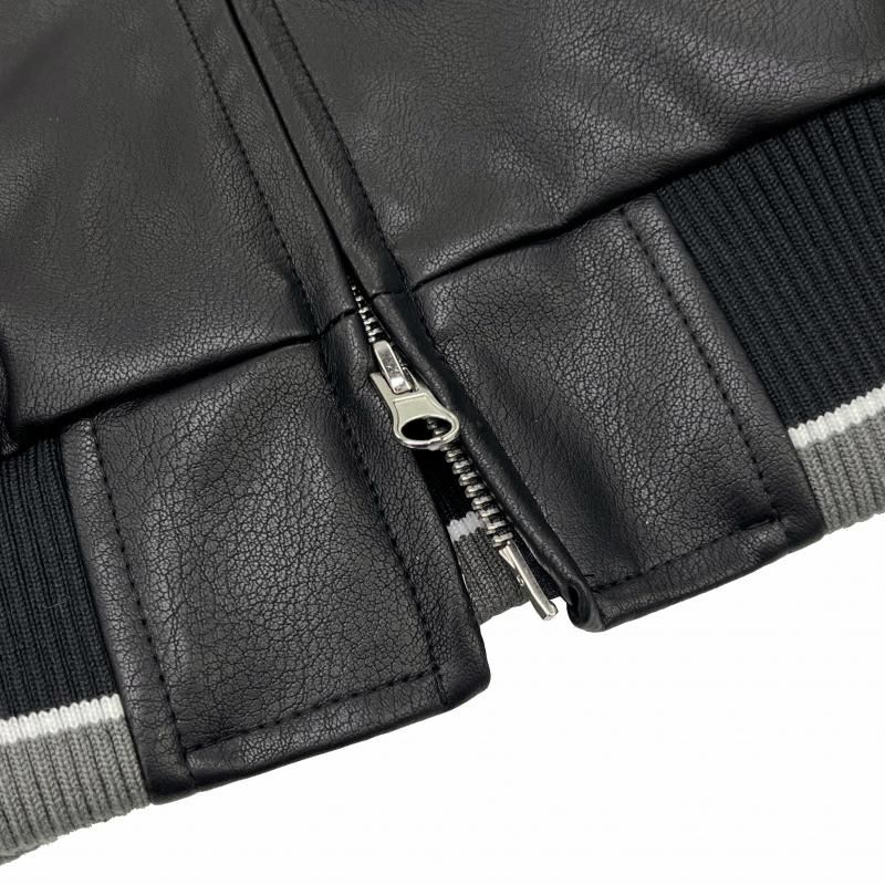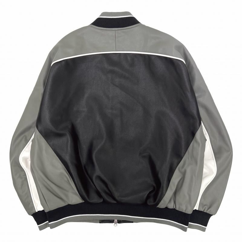 フロントにブランドネームの刺繍、身頃・袖に切替え・パイピングによる配色を用いたスポーティーなデザインのPUレザージャケット。