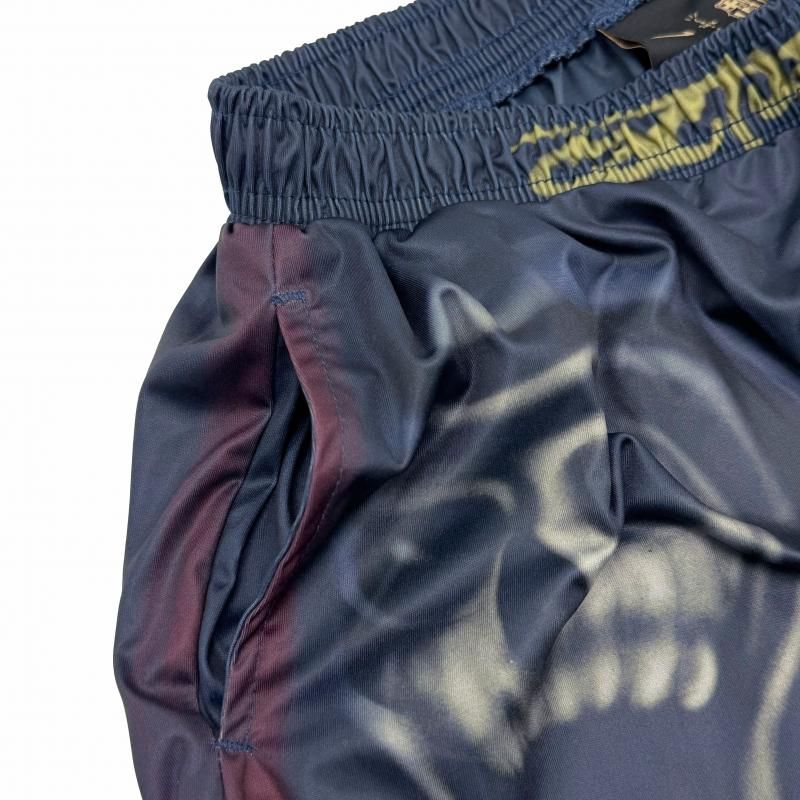 スカルデザインやチームロゴのプリントに加え、各ブランドロゴの刺繍を施したポリエステル生地のショーツ。