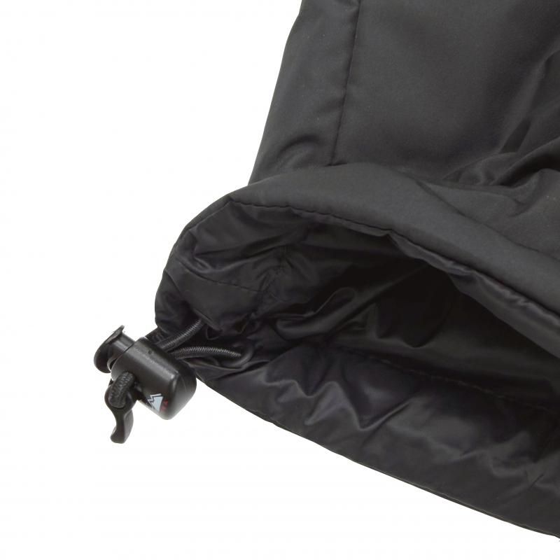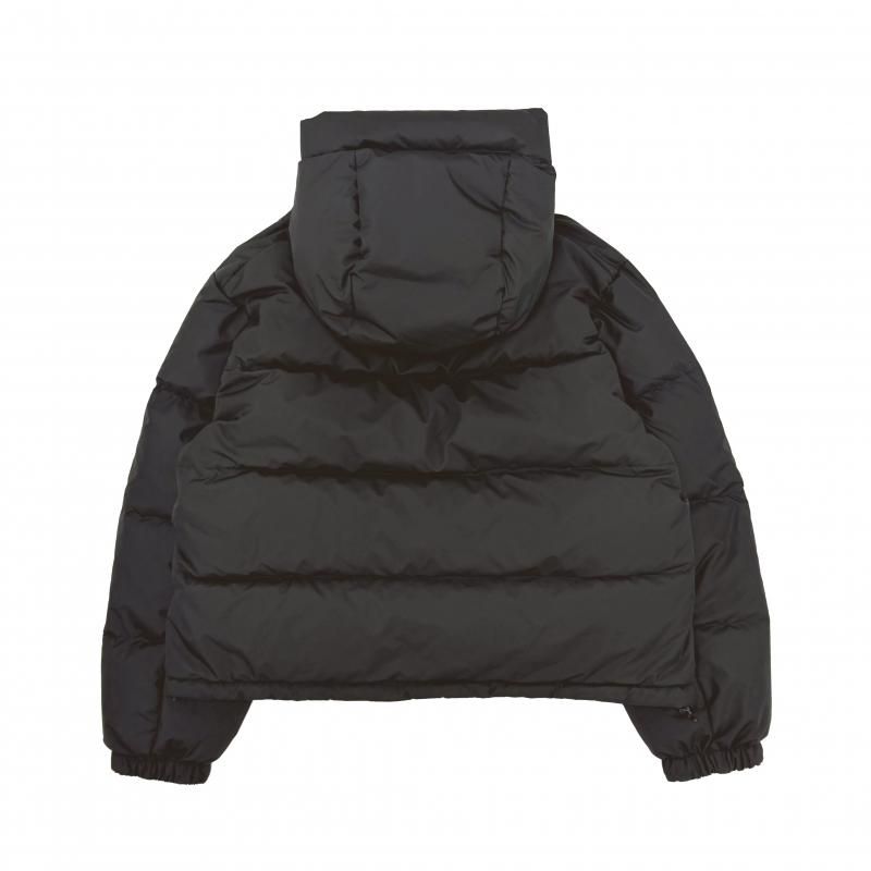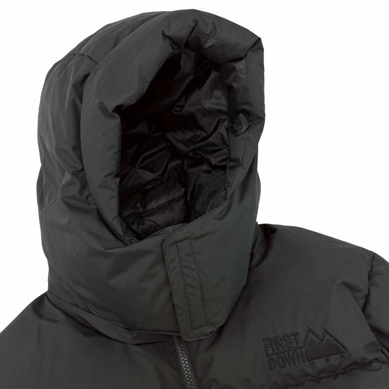 表側の胸元・裏側の衿に生地と同色のブランドロゴ刺繍、着脱可能なフードと裾にはドローコードが施されています。