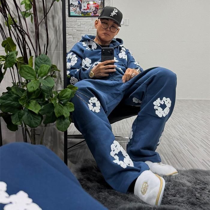 デニムティアーズを象徴するコットンリースデザインの発砲プリントをランダムに落とし込んだバギーシルエットのスウェットパンツ。