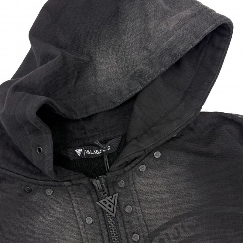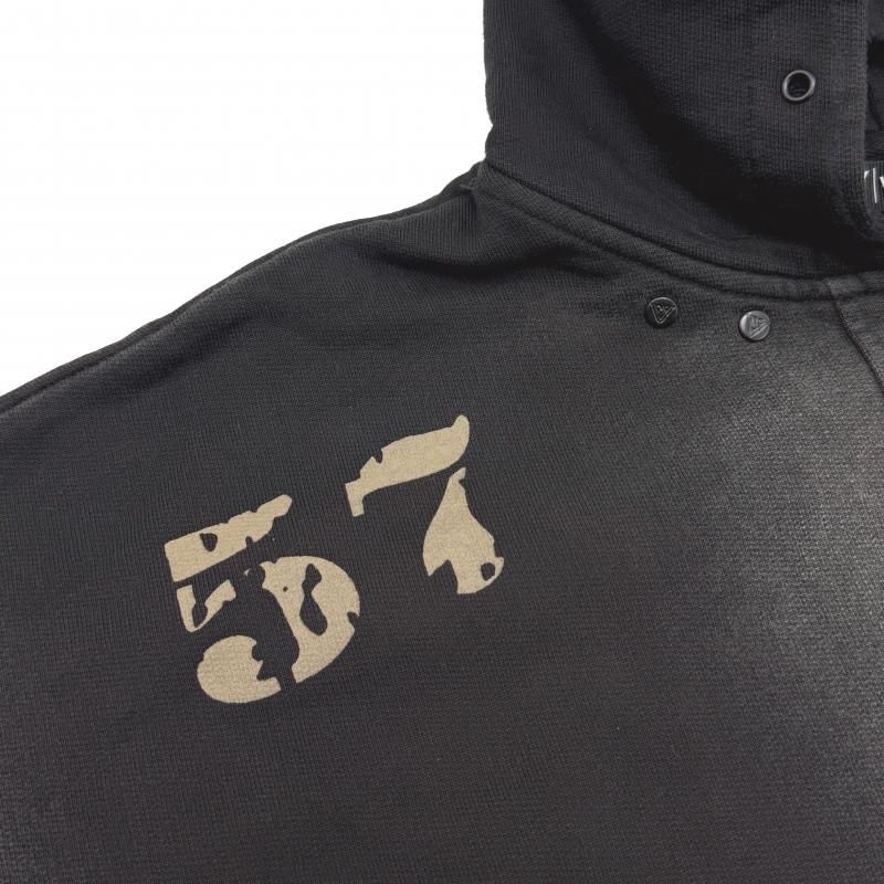 フード・前立て・ポケット口等にハトメやリベットを施したボックスシルエットのハーフジップパーカー。