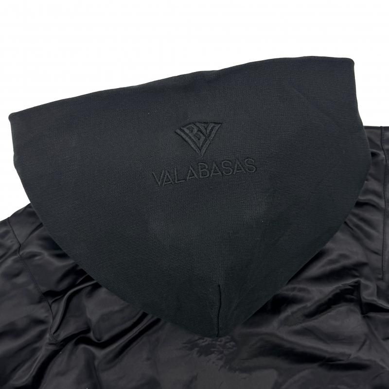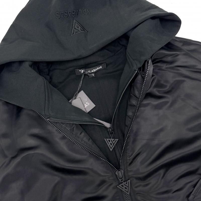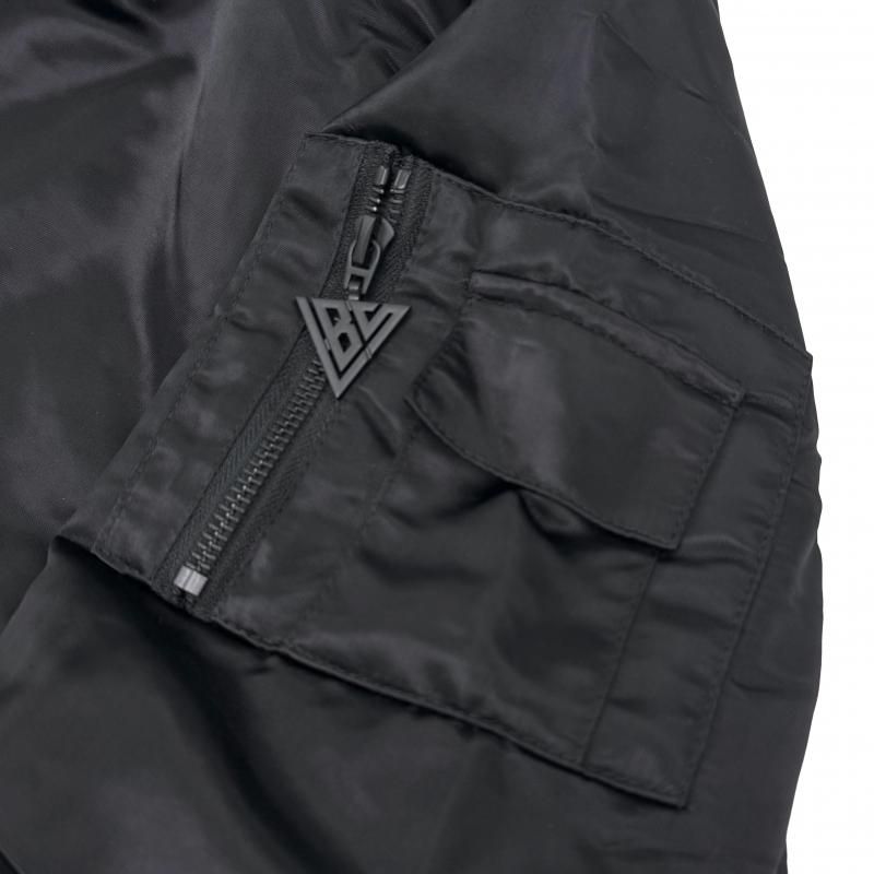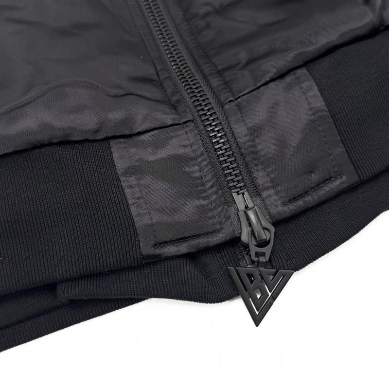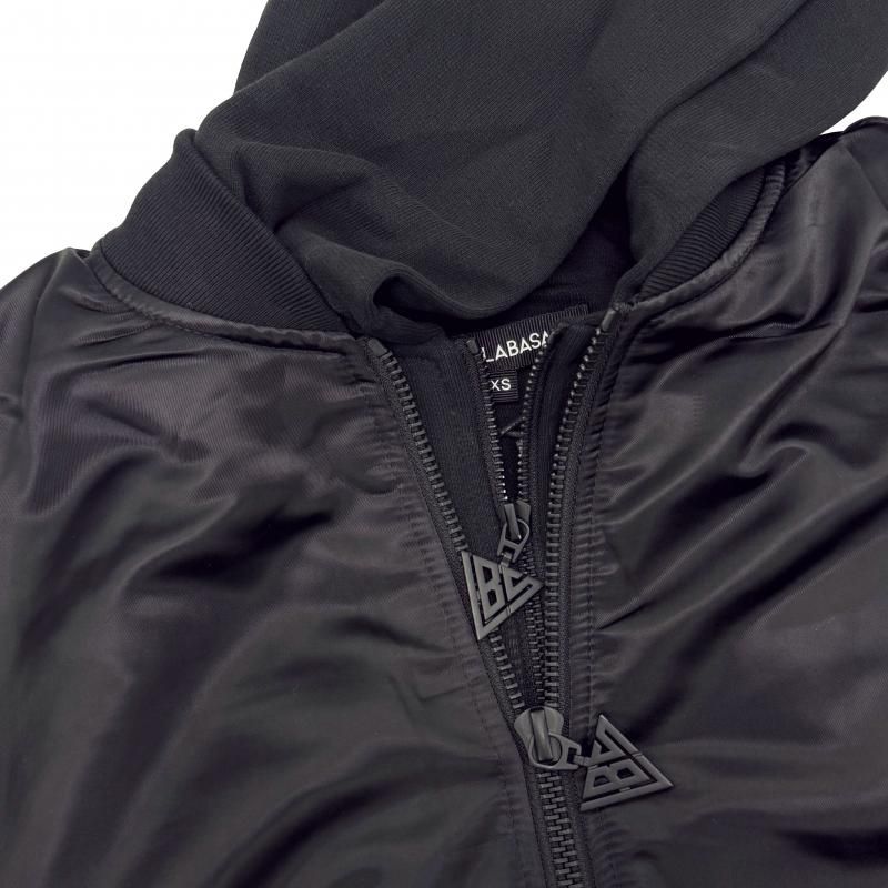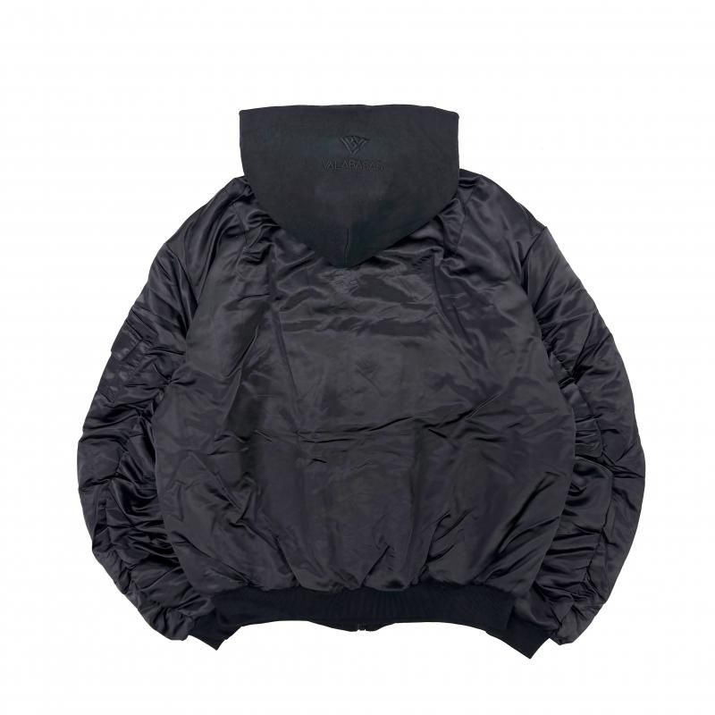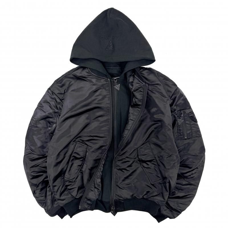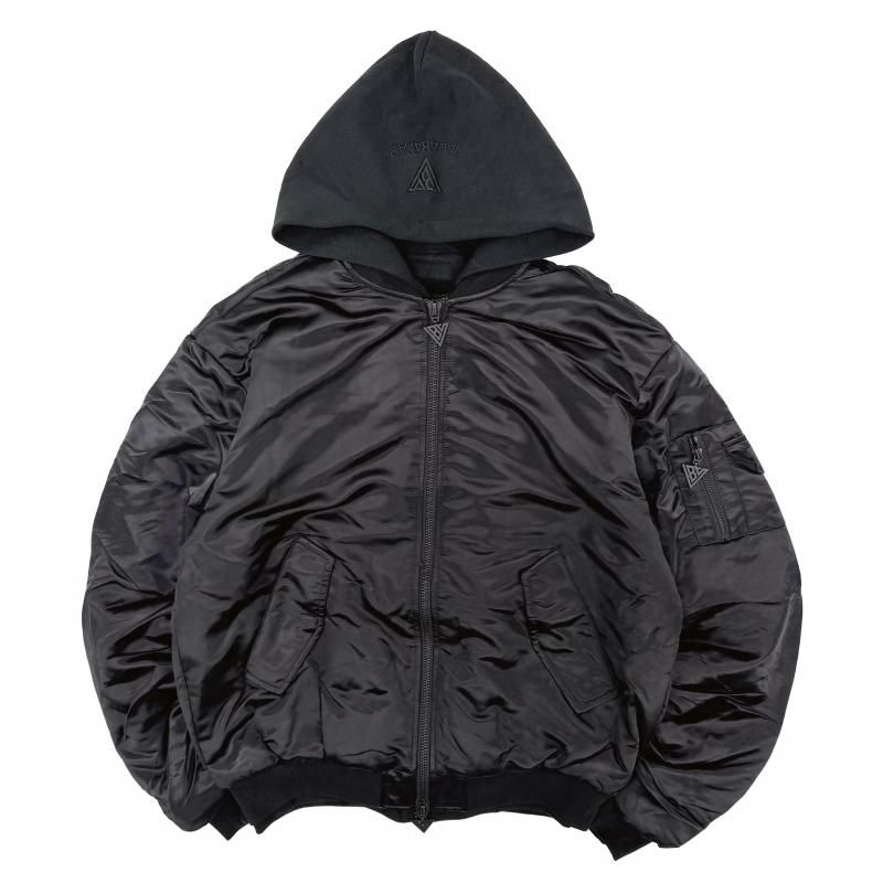 内側にスウェット生地のフード・前立て・裾リブを施しレイヤー調なデザインを用いたボンバージャケット。