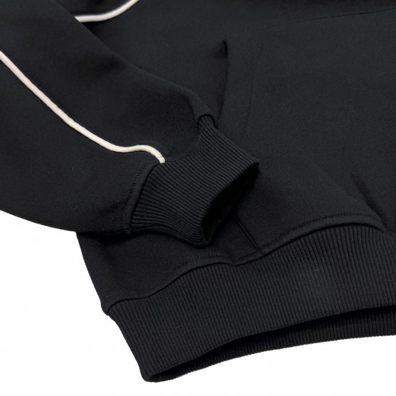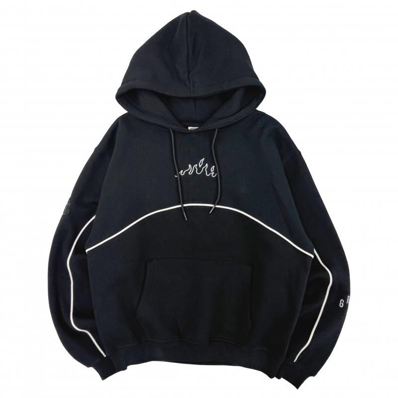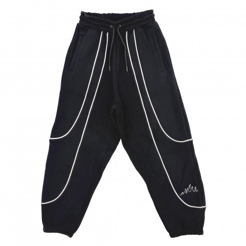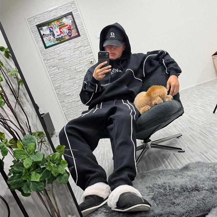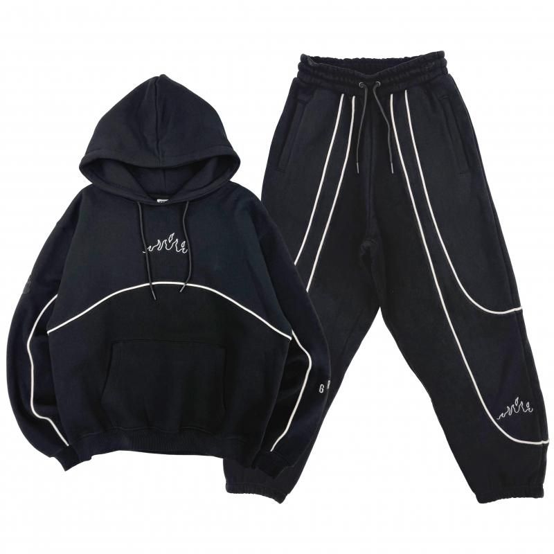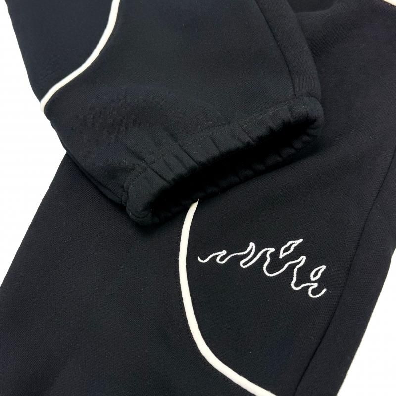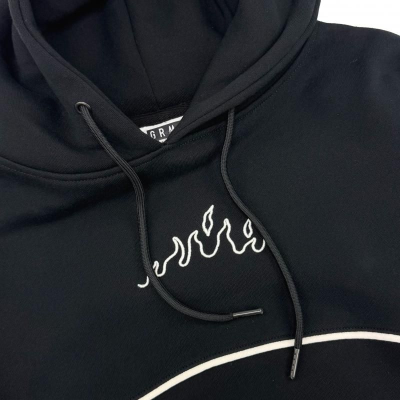 胸元と左袖とパンツの左裾にフレイムデザイン、左袖にブランドネームの刺繍、右袖にはラバーワッペンが施されています。