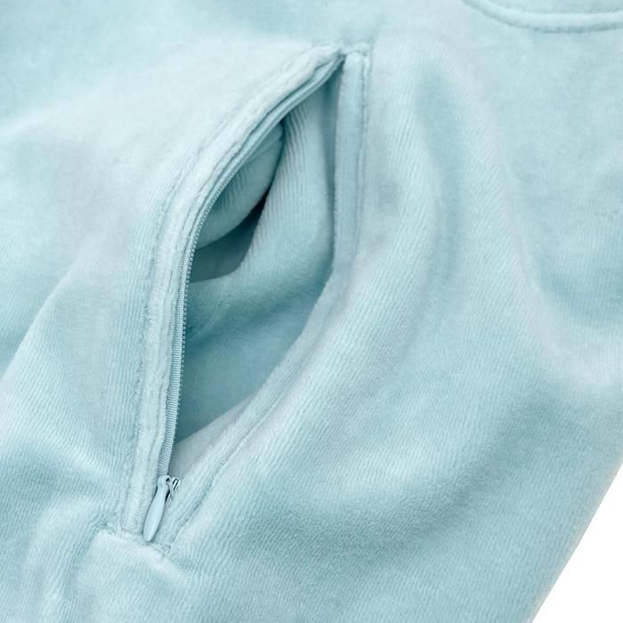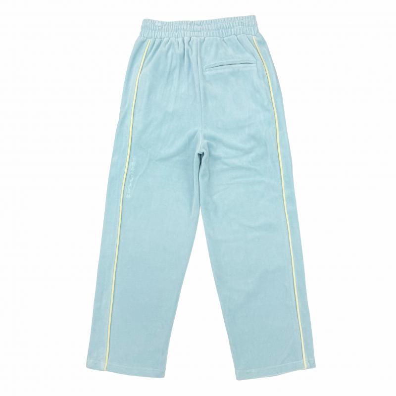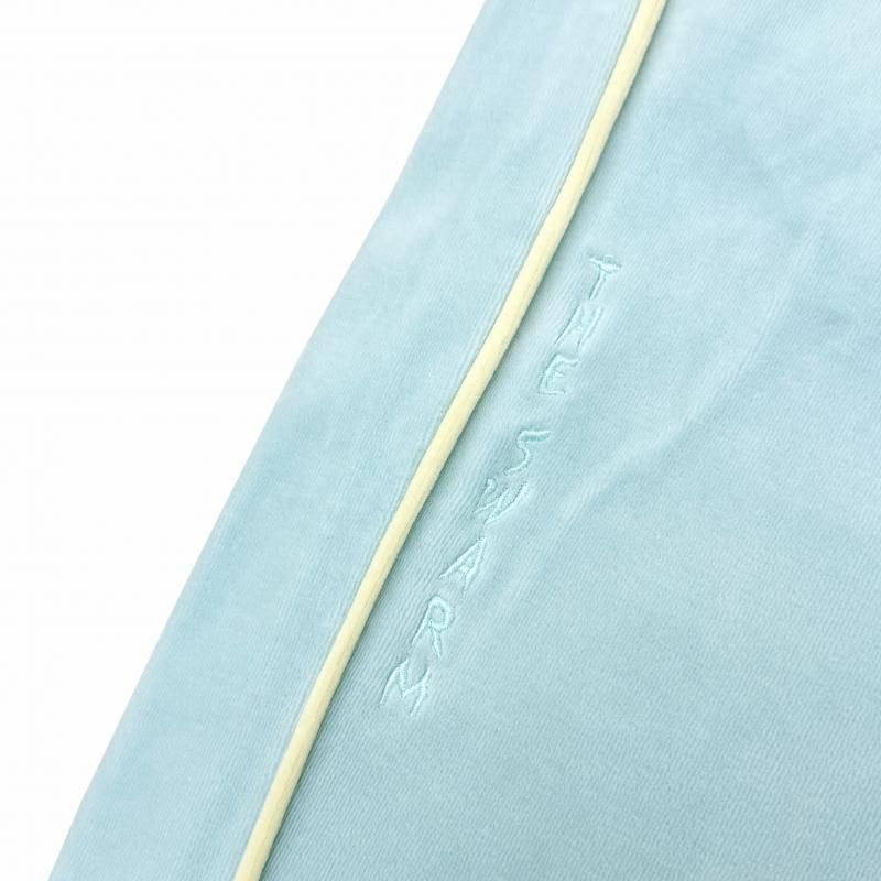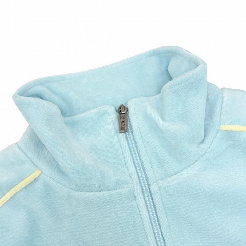 袖とパンツのサイドにパイピングデザインを施したベロア生地のセットアップ。