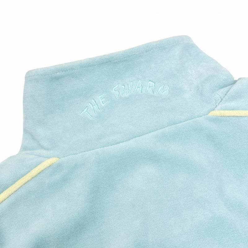 胸元と左ももにコラボロゴ、左袖と右ももにキャラクターのアイコン、衿のバックと左もも裏にTHE SWARMの文字を刺繍で施しています。