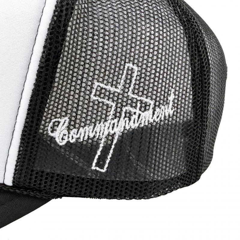 フロントにクロスデザインのプリントとブランドネームを用いたデザイン刺繍を施したメッシュキャップ。