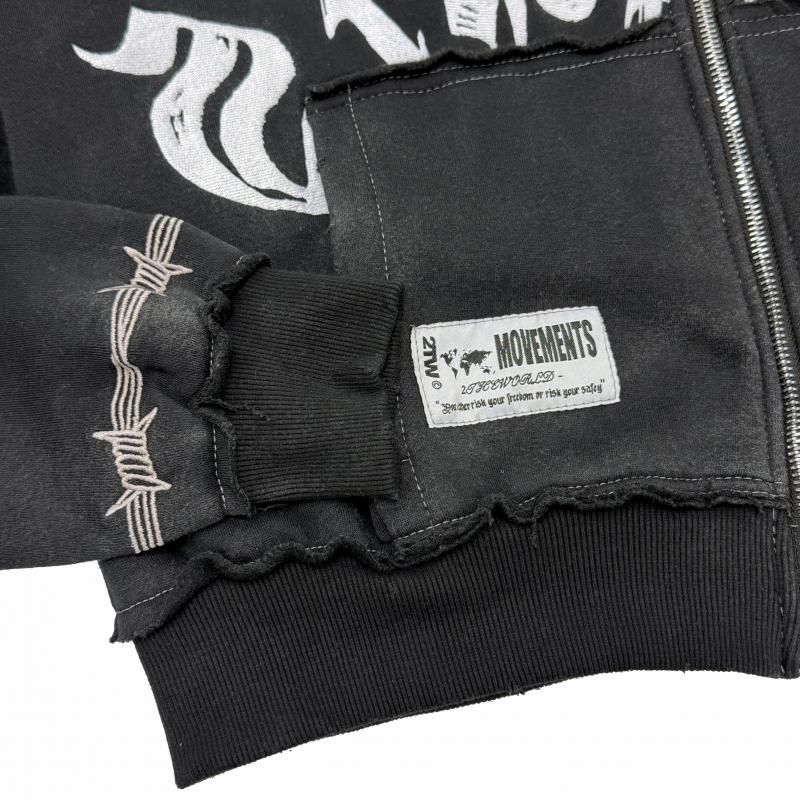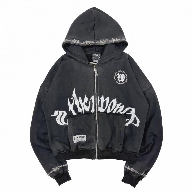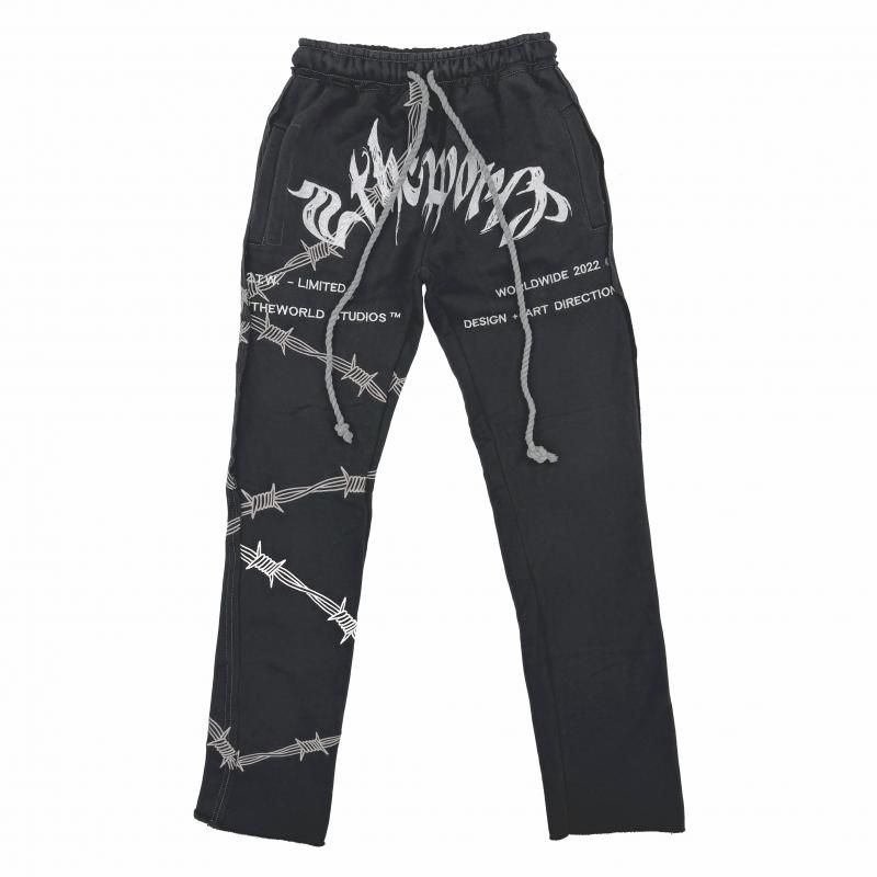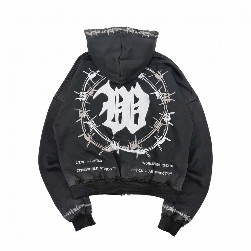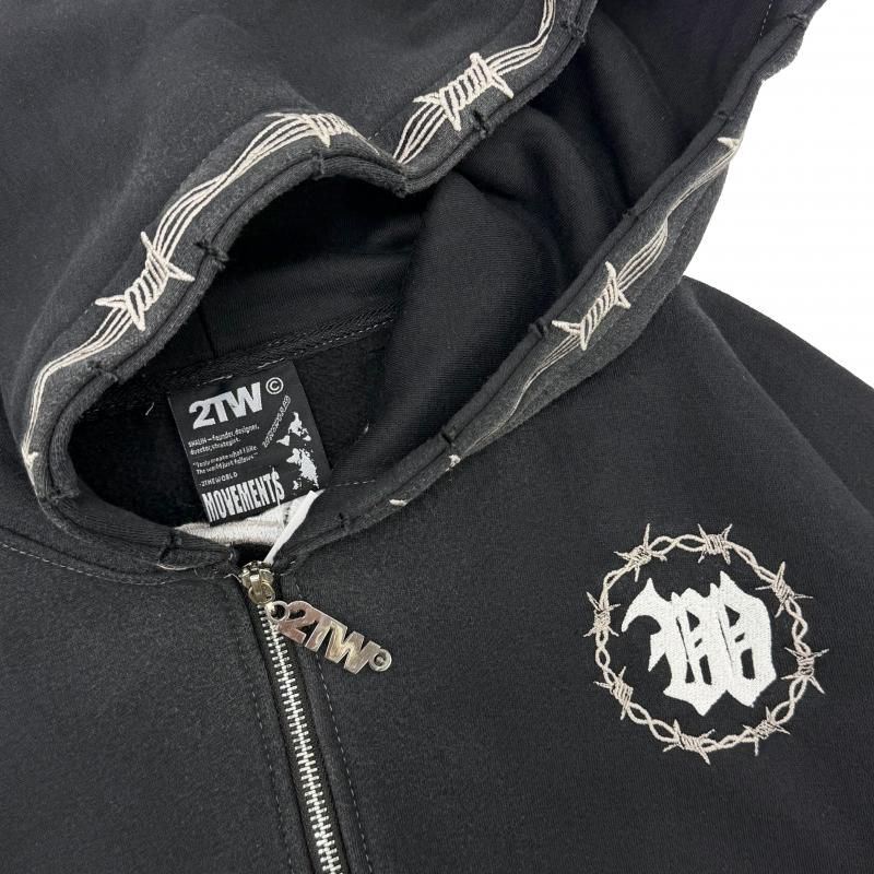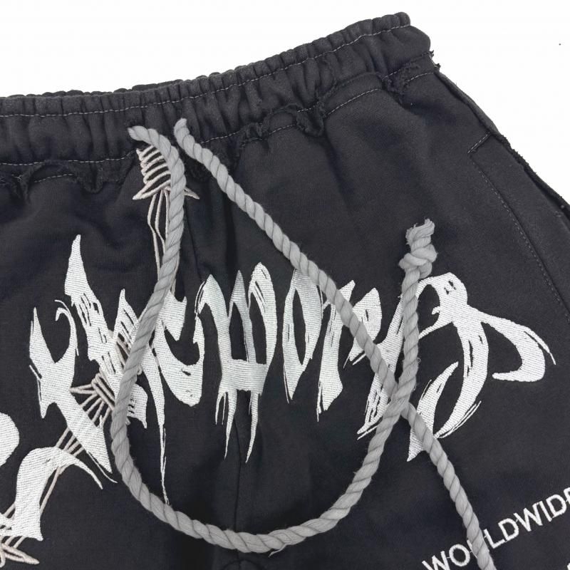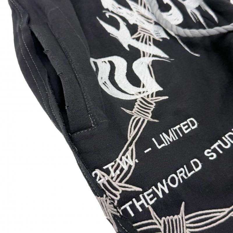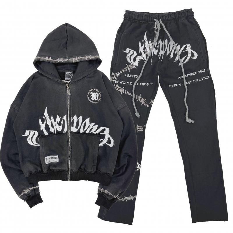 随所にブランドネームや有刺鉄線の刺繍を施したスウェット生地のセットアップ。