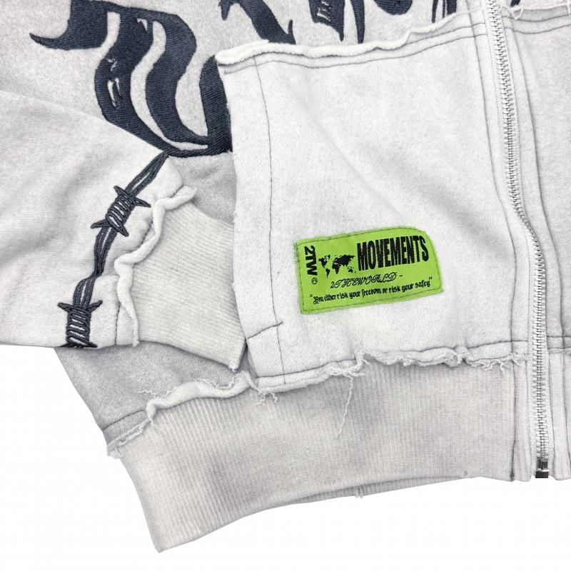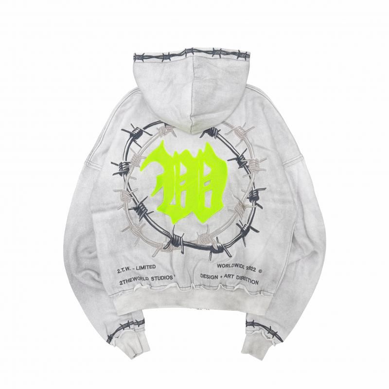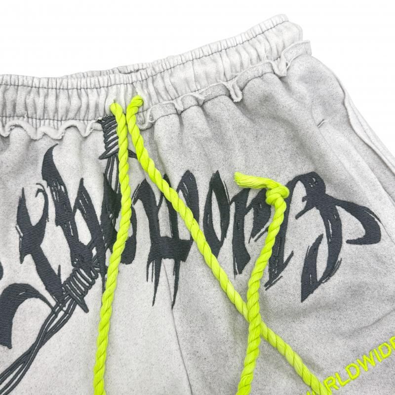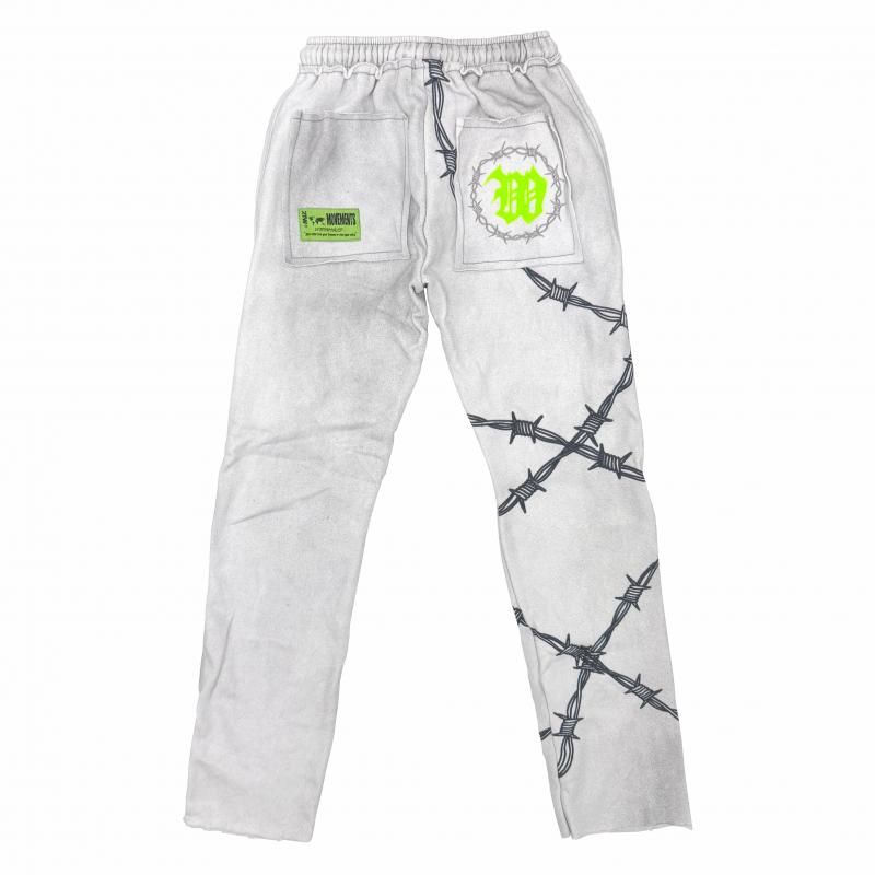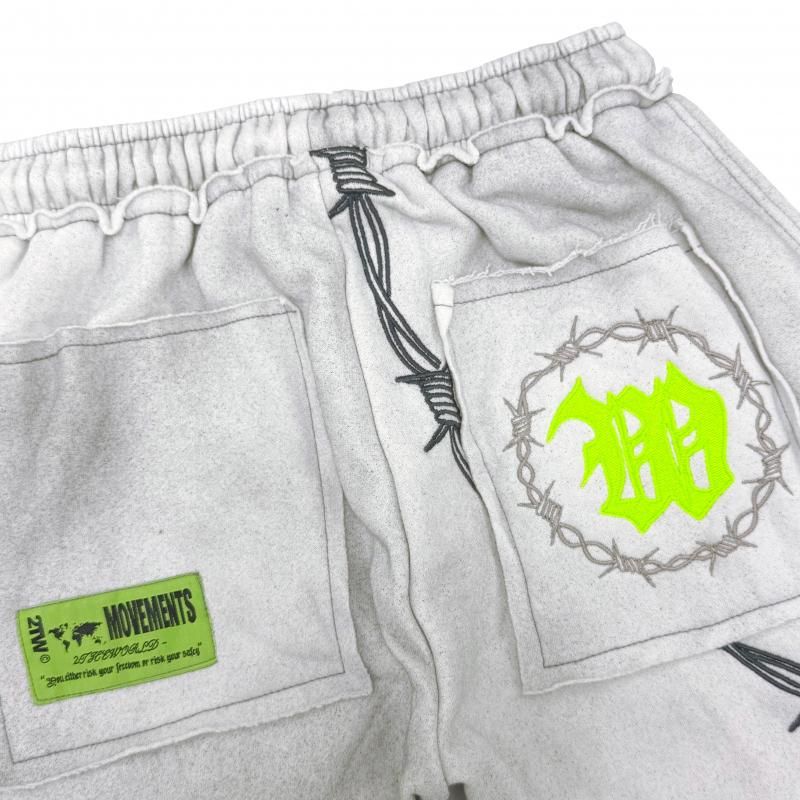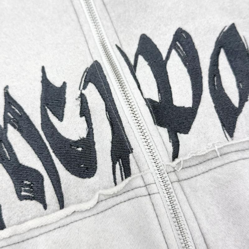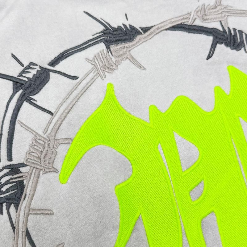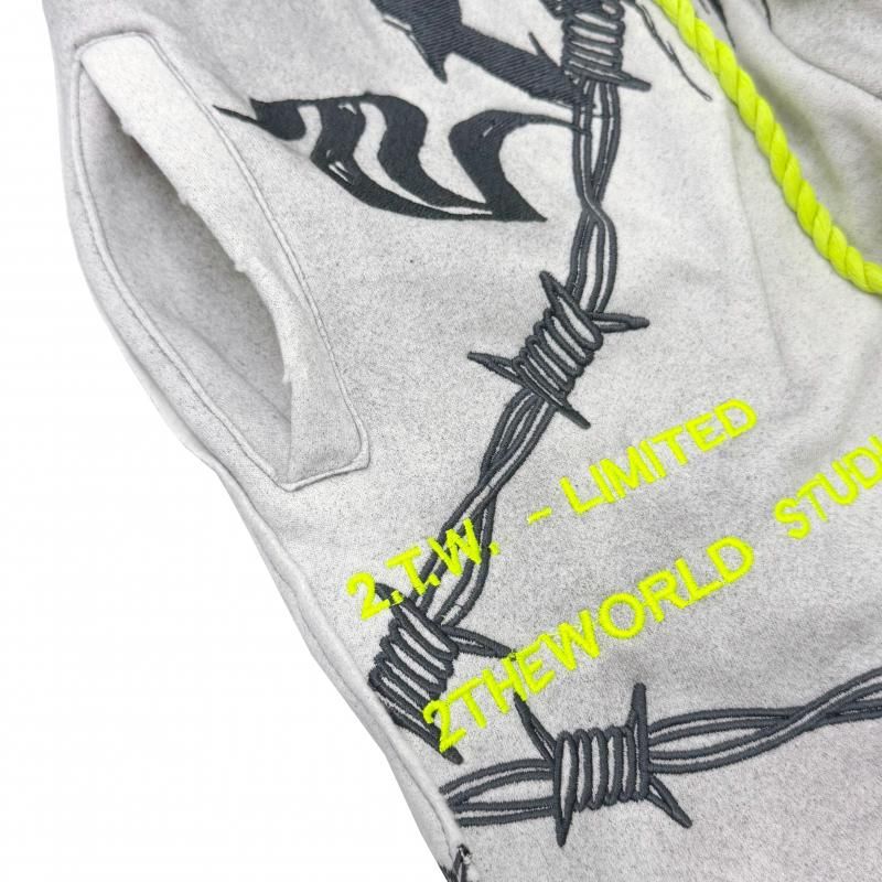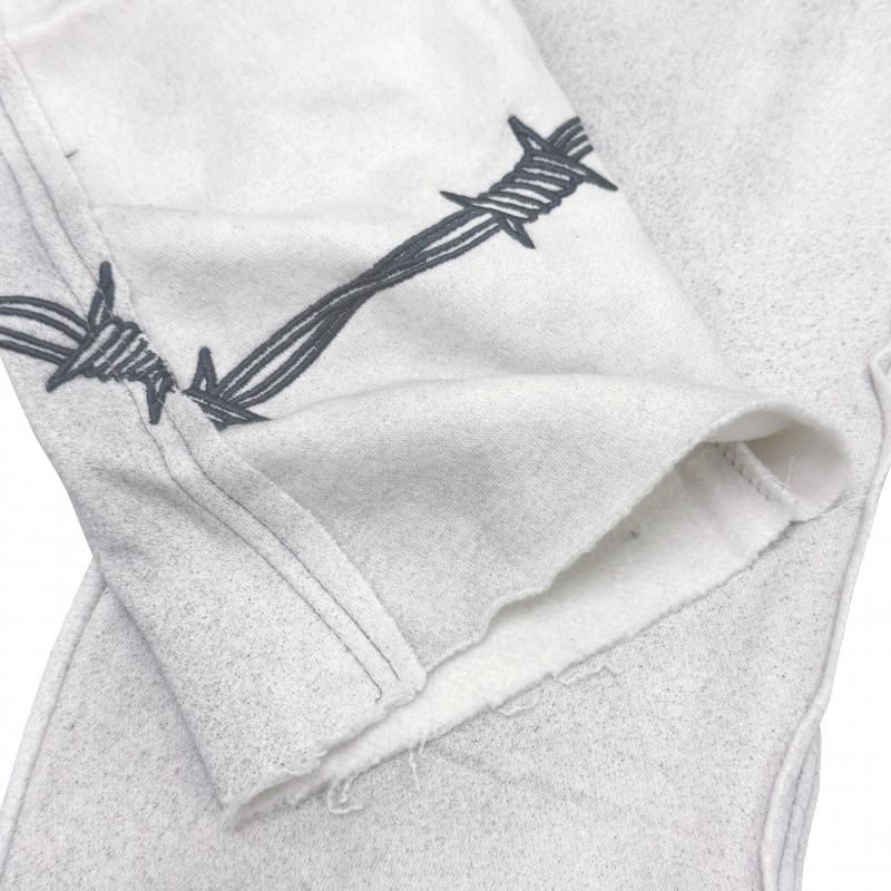 随所にブランドネームや有刺鉄線の刺繍を施したスウェット生地のセットアップ。