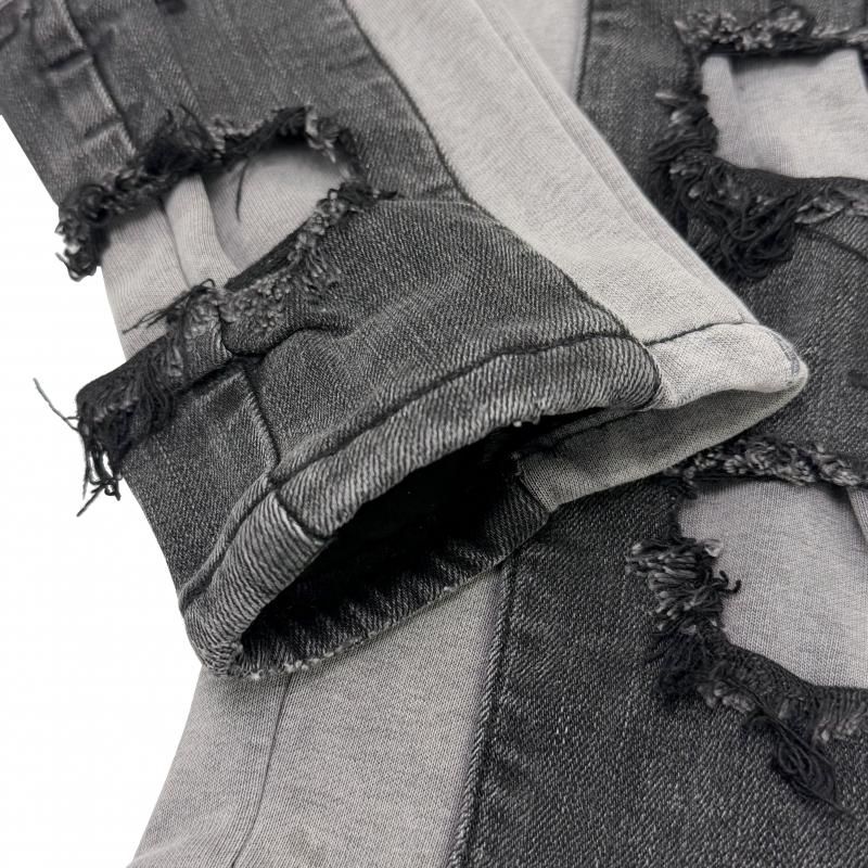 異素材(ストレッチの効いたスウェット生地とデニム生地)を組み合わせたスキニーシルエットのデニムパンツ。