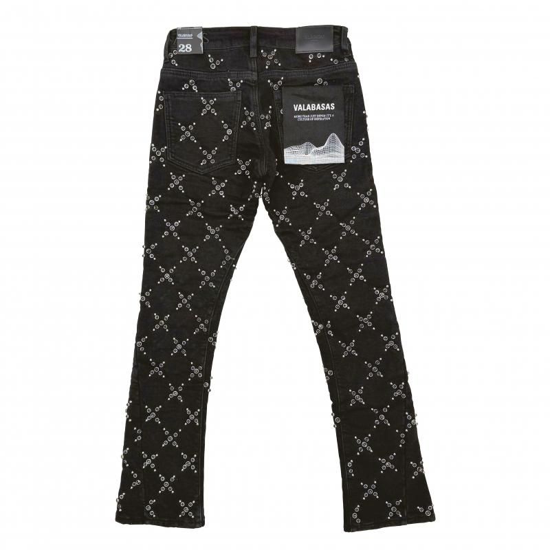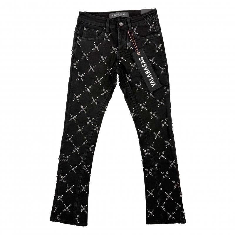 ラインストーン付きのスタッズなどを全面に施したフレアーシルエットのスタックドデニムパンツ。