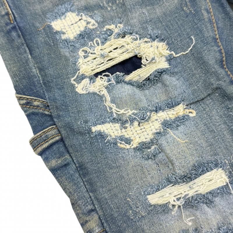 随所にダメージ加工、リペア加工を施したフレアーシルエットのスタックドデニムパンツ。