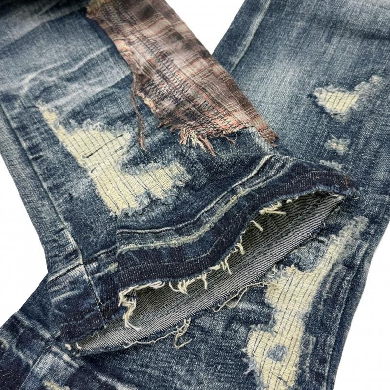 ダメージ&リペア加工を施したフレアーシルエットのスタックドデニムパンツ。