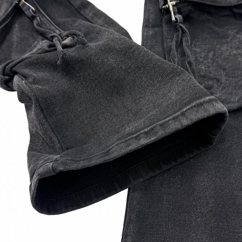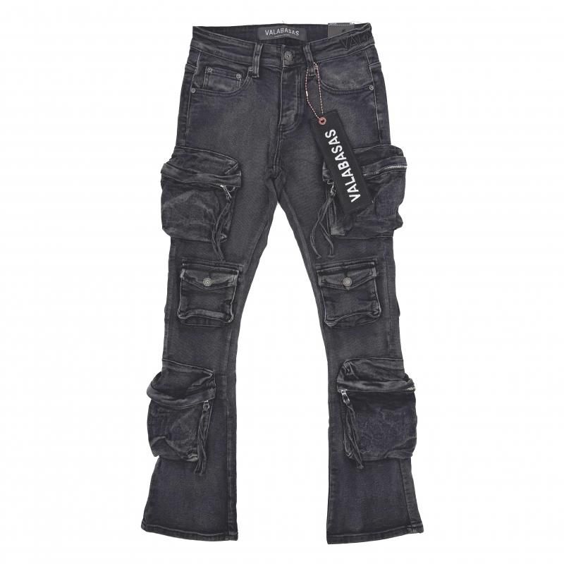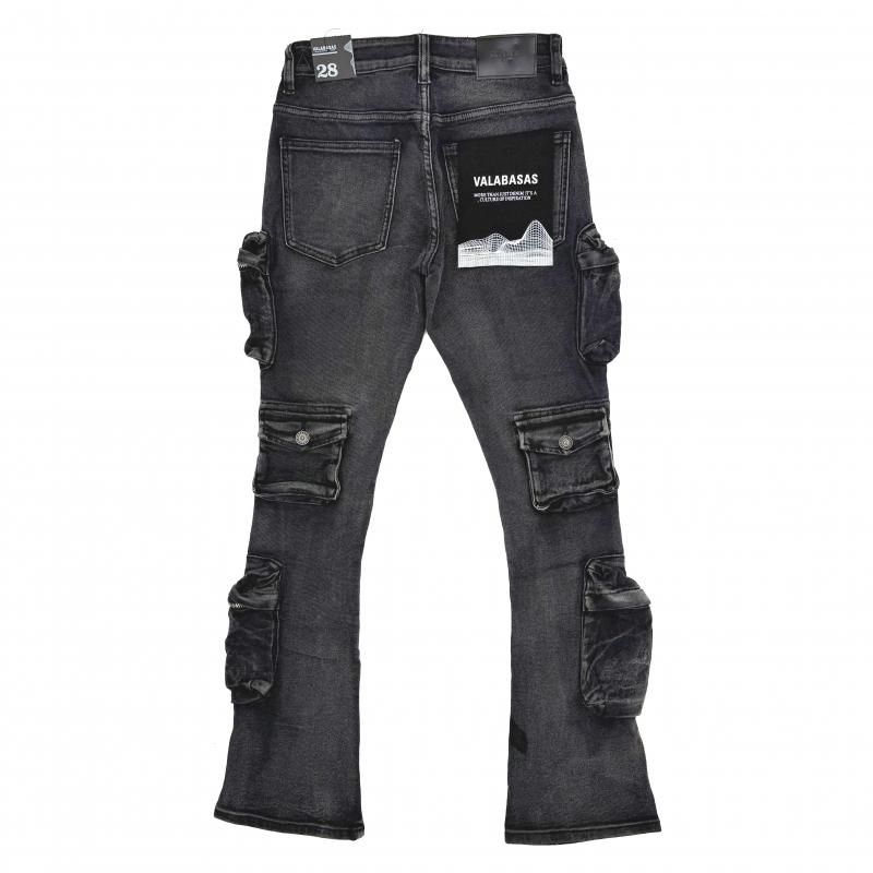 立体的なカーゴポケットを前後左右に施したフレアーシルエットのスタックドデニムパンツ。