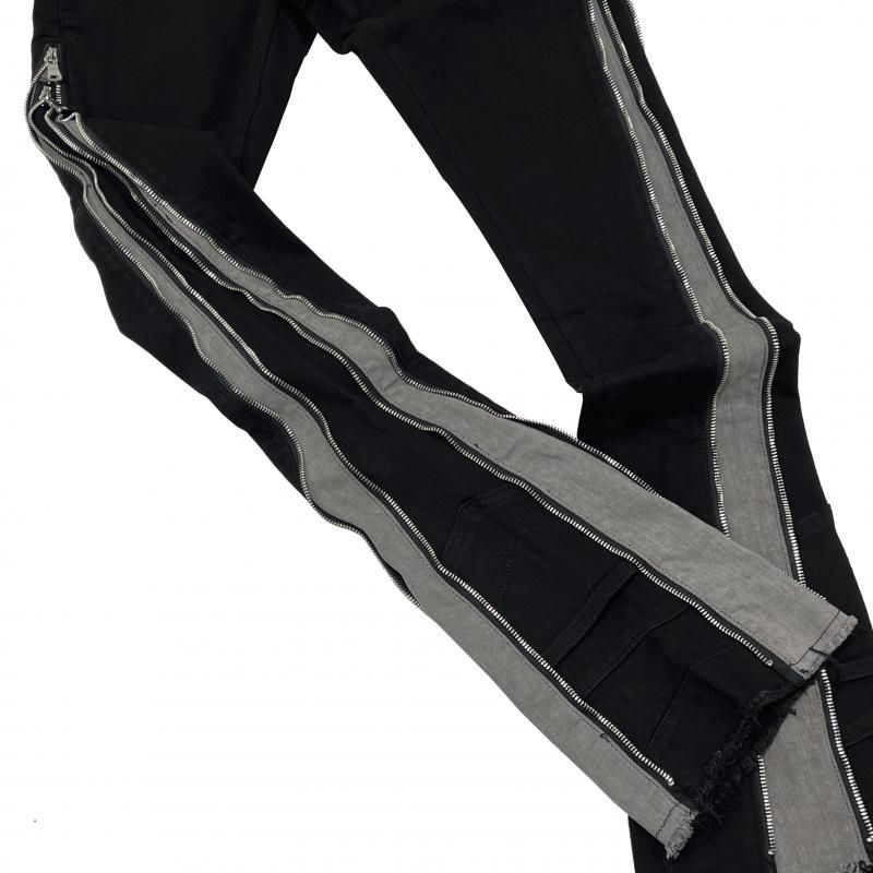 サイドに切替しによる配色とファスナーを施したフレアーシルエットのスタックドデニムパンツ。