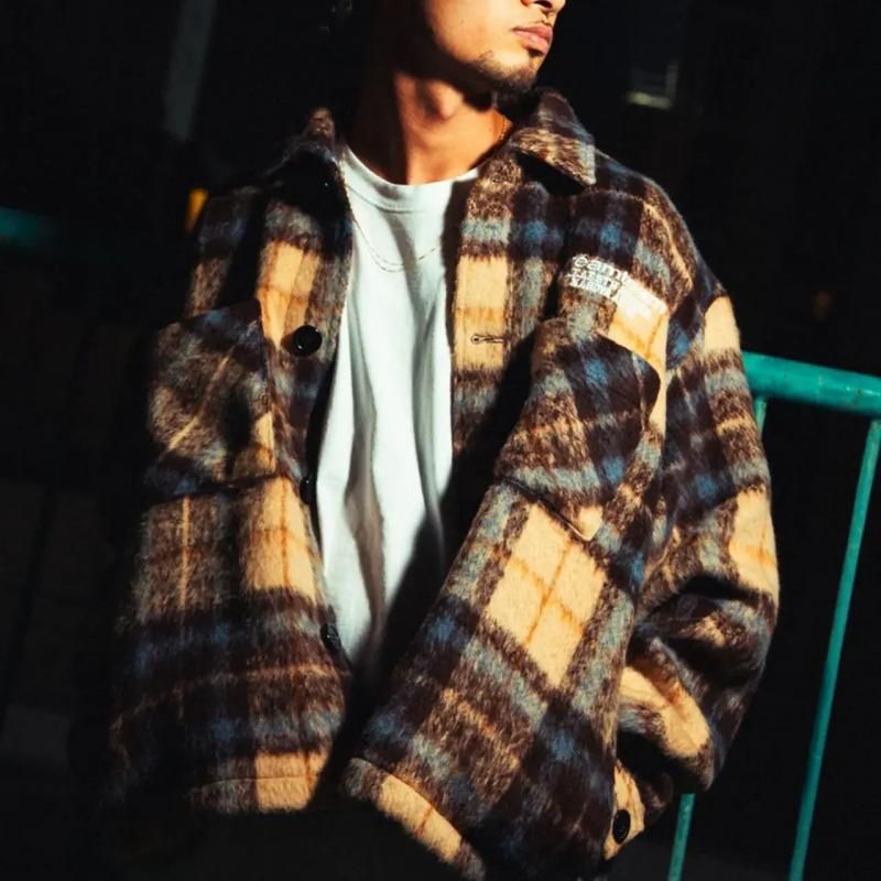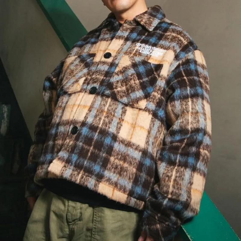 チェック柄のモヘアー生地を用いたクロップド丈のフランネルジャケット。