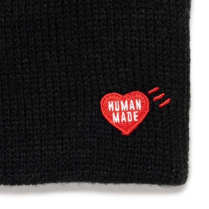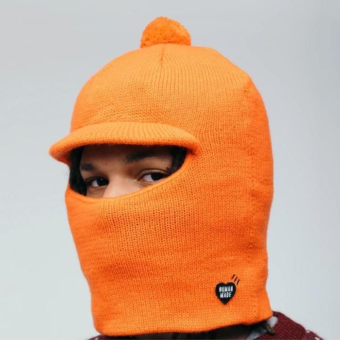 裾部分にハートのワッペンを施した頭から首までを覆うバラクラバ仕様の2wayニットキャップ。