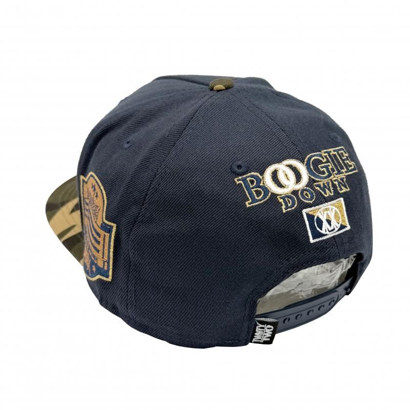フロントにブロンクスのBXロゴ、両サイドにブロンクスをモチーフとしたロゴ、バックにBOOGIE DOWNの刺繍が施されたスナップバックキャップ。