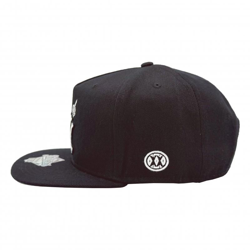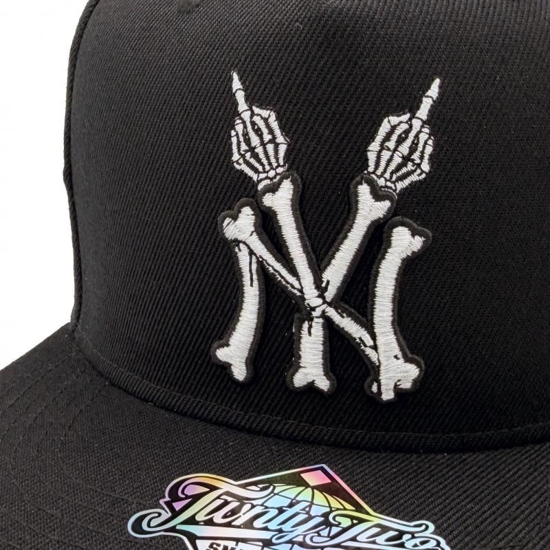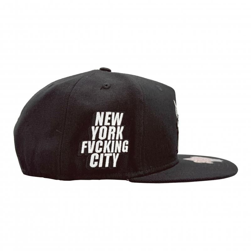 フロントにスカルを用いたNYロゴ、サイドにNEW YORK FVCKING CITYの文字n他、ワンポイントロゴの刺繍が施されたスナップバックキャップ。