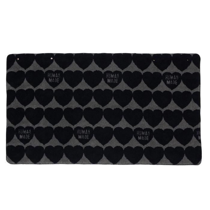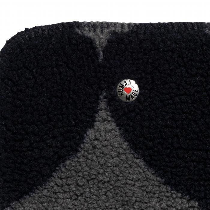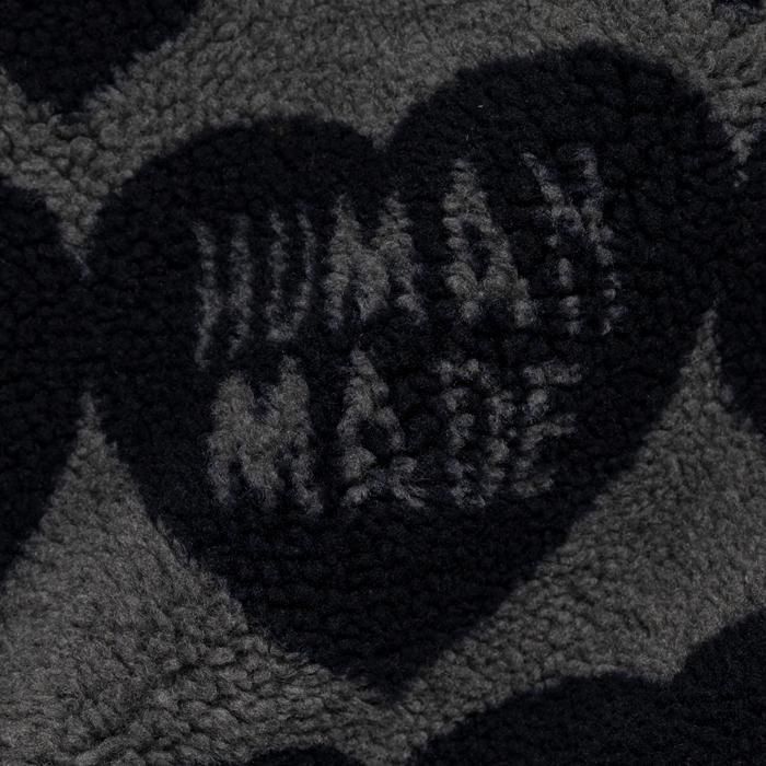 暖かく包み込むポリエステルボア素材にハートモチーフの総柄パターンを落とし込み、裏面はフリースを貼り合わせたボンディング素材を使用。
